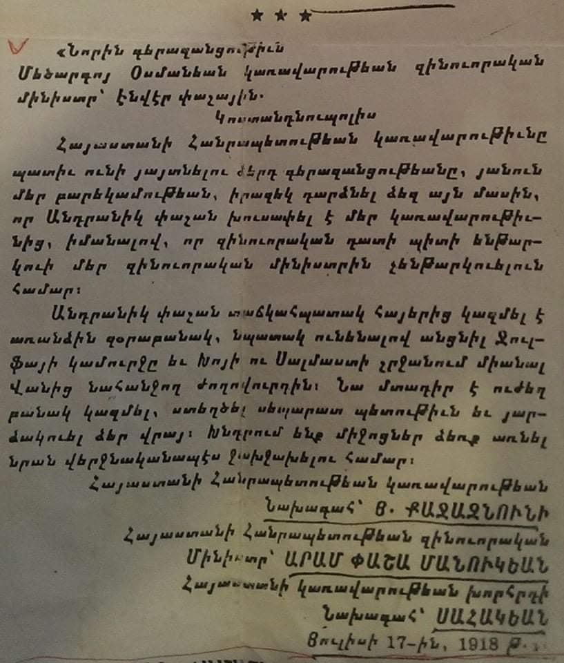 Письмо Эневеру паше от армянского правительства о том,что генерал Андраник Озанян намерен защищать армянские население от геноцида. В письме подробно сообщается координаты Генерала Андраника. Чтобы турецкое правительство смогла его арестовать и казнить. Так что Пашиняны не новость для нашего народа. Этим все сказано. Кого виним,армяне ?